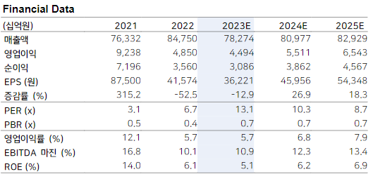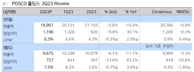 3Q23 실적은 연결 기준 매출액 19.0조원(-10.4% YoY, -5.8% QoQ), 영업이익 1.2조원(-30.1% YoY,-9.82% QoQ, OPM 6.3%)으로 영업이익 컨센서스에 부합했다.